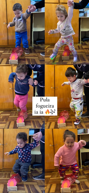 Atividades de sopro: fogueira de São João e pipoca no pote. As atividades de sopro fortalecem os músculos faciais, e auxiliam no desenvolvimento do oralidade.