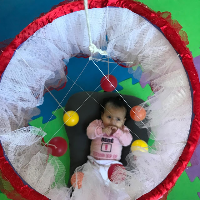 Uma brincadeira com elásticos e chocalhos que ficou muito atraente. Ver o brinquedo voltar e ficar batendo após ser puxado, despertou muitos interesses.